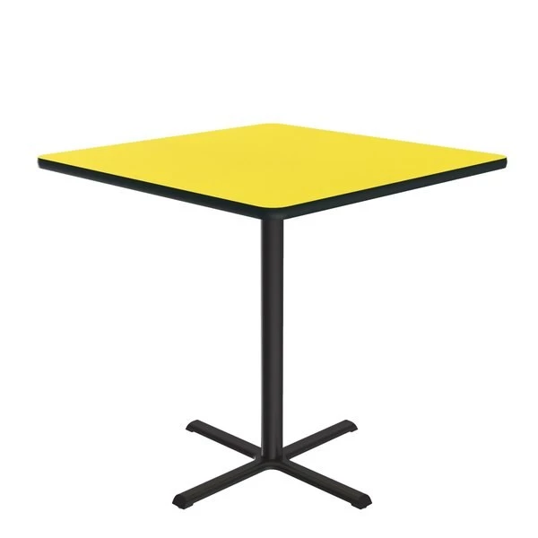 Correll Café, & Break Room Tables. Built for the harsh demands of Commercial use. These 42" bar height tables are the perfect height for standing or use with stools. 36" Square Yellow Rectangular high pressure laminate Top. Laminate surface resists scratches and stains and offers a hard, flat surface. Top also features a Backer sheet on underside of table that helps protect against moisture entering the underside of the table causing warping. Black textured cast iron spider and X-base with 3" steel column for strength and durability. Bases include nylon leveling guides for study placement. Black T-Mold edges provide protection to both the table and your walls. Meets BIFMA Standards. . YOU CAN COUNT ON CORRELL: Correll was established in 1969 and has been in business for over 50 years. With our out Standing Customer Service, innovative new product lines, and the largest selection of Folding Tables available from any manufacturer, now, more than ever, you can count on Correll.