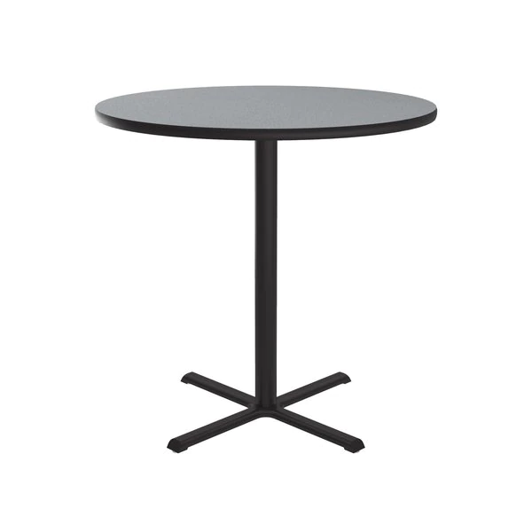 Correll Café, & Break Room Tables. Built for the harsh demands of Commercial use. These 42" bar height tables are the perfect height for standing or use with stools. 48" round Gray Granite Rectangular Thermal Fused laminate Top. Thermal Fused Laminate (TFL) is a resin infused laminate not glued on like high pressure laminate, it is fused to the board using a heat treatment process. 1 1/4" thick high density top is sealed on both sides preventing moisture from entering the table and causing warping. Black textured cast iron spider and X-base with 3" steel column for strength and durability. Bases include nylon leveling guides for study placement. Black T-Mold edges provide protection to both the table and your walls. Meets BIFMA Standards. . YOU CAN COUNT ON CORRELL: Correll was established in 1969 and has been in business for over 50 years. With our out Standing Customer Service, innovative new product lines, and the largest selection of Folding Tables available from any manufacturer, now, more than ever, you can count on Correll.