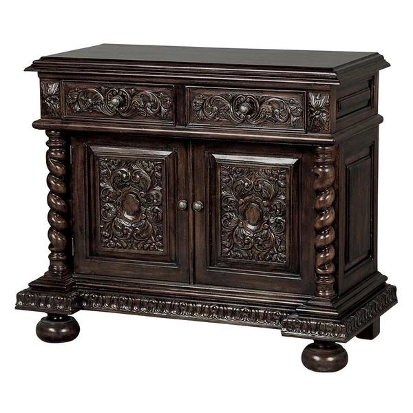 Created at a time when the mystery and romance of the Gothic Renaissance period became a source of inspiration for craftsmen and artists, this handsome Design Toscano original buffet features a step front face. Your eye immediately falls to the Barley Twist columns and gloriously carved foliate panels in the double doors, but this solid mahogany masterpiece opens to reveal functional storage. Two drawers and elegant metal hardware enhance this antique replica work of furniture art whether it's used for serving or display! 36"Wx181⁄2"Dx321⁄2"H. 79 lbs.