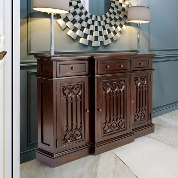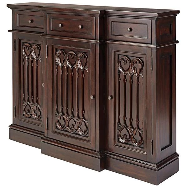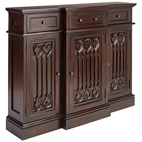 The 15th century, Gothic-style fretwork gracing its triple doors instantly alerts the admirer that this is not simply a functional work of furniture art! Whether outfitted as a coffee bar, used for table linens, or offering up games and puzzles for the family, it s a true workhorse. And though it extends almost 41⁄2-feet end-to-end, its shallow depth keeps it from being imposing and makes it perfectly suited to a hallway or other busy space. Hand carved of solid mahogany, our Design Toscano exclusive with metal knobs boasts a hand-rubbed, antique finish to easily meld with your decor. 511⁄2"Wx12"Dx40"H. 77 lbs.