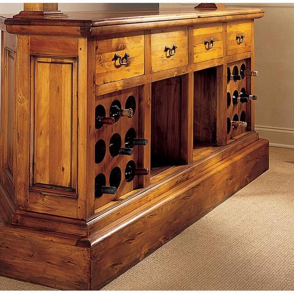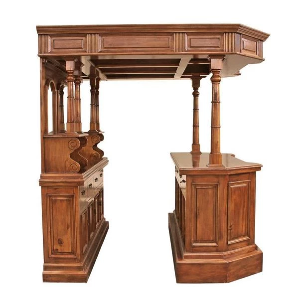 So charmed were we by the tiny pub, nestled within this enchanting British West midlands inn, that we wanted to take it home with us and have it replicated! Imagine yourself serving drinks from under the canopy, your closest friends gathered around the concave stand-up bar, their smiles reflected in the wide, bevel mirror-backed counter. Though we've scaled it for home use, its ample storage includes 8 drawers and 4 cabinets (all with brass pulls), room for 40 bottles, 4 shelves and row upon row of stem holders up top. You'll add instant atmosphere, and history with this substantial, honey-stained distressed high-quality pine bar, held up by 6 supporting pillars – the only authentic English pub this side of the Atlantic! Simple assembly required. Arrives in 3 major pieces that 3-4 people can interlock to form a sturdy structure. 80"Wx79"Dx91"H. Approx. 800 lbs.