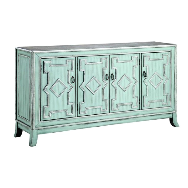 Four-door credenza with three fixed shelves and wire management on back panel. Door panels feature raised diamond shape molding and antique bronze drop ring hardware. Medium brown wood-finish top.