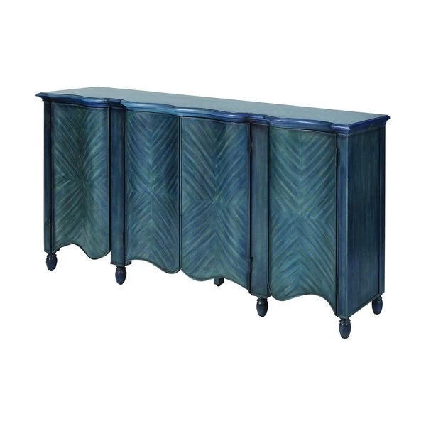 The Beck Credenza is a painted navy storage cabinet featuring four curved wood doors with shelves within. Door panels feature a wood grain "X" pattern with touch-latch hardware. This piece is a simple and elegant addition to a living room or dining room.