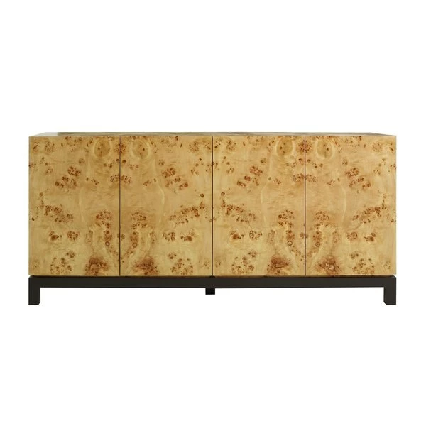 The Bromo Credenza is made from beautiful mappa burl wood with a solid ebony-finished plinth base. Featuring four doors that push to open to reveal inner storage shelving, this credenza offers versatile storage for a dining room or living room.