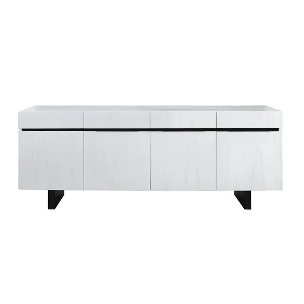 The Checkmate Credenza is a white painted wood storage credenza featuring four drawers and four doors, which open to reveal adjustable shelving within. This two tone black and white credenza offers style and versatile storage for a dining room or living room.