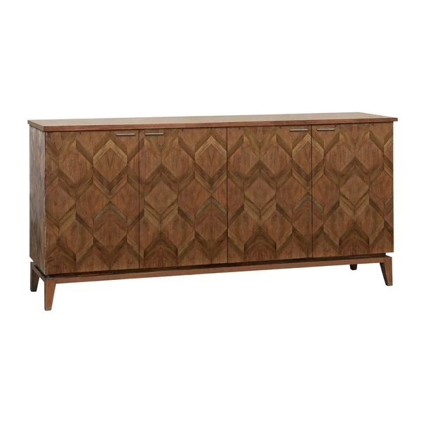 The Moss 4-Door Credenza is a low, wide storage piece featuring a herringbone pattern made from inlaid and interlocking wood grain in a mahogany finish. Four doors offer ample storage, ideal for a living room or dining room.