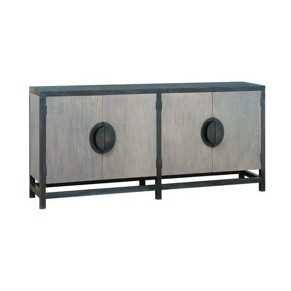 This hand-crafted credenza comes with custom-made handles and a hand-applied rich, grey finish. The framework that supports the cabinet has an aged patina finish, giving this piece a rustic dimension. Built from plywood and mahogany, this 4-door cabinet is a sturdy and spacious addition to a living room or dining area.