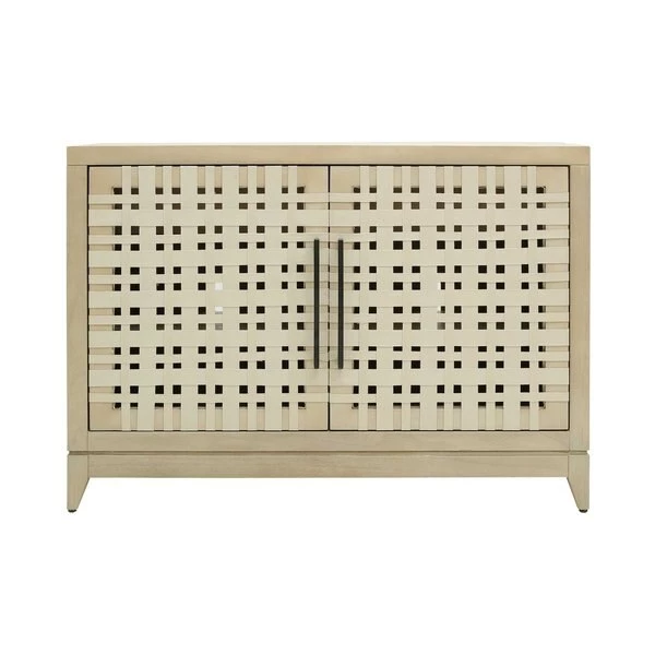 The Sunset Harbor Credenza is a small scale storage cabinet with two doors and adjustable shelving within. The doors feature natural cotton webbing loosely woven in an open grid pattern. The wood cabinet and plinth base are painted in a versatile taupe Shady Cove finish, with black decorative hardware.