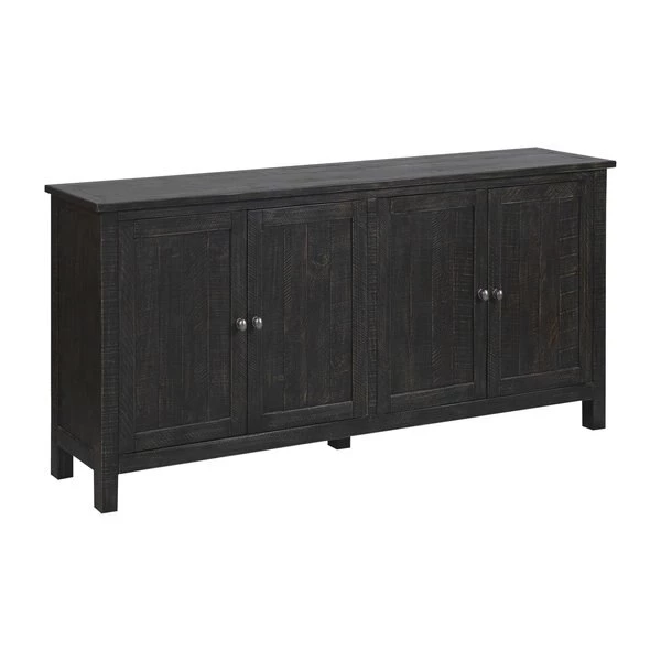 The Thornton 4-Door Credenza is a wood storage piece painted with an antiqued black finish. Four solid doors open to reveal shelving within. Perfect for a relaxed coastal or farmhouse setting, this cabinet offers maximum storage options for a dining room or living room.