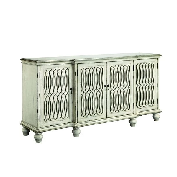 Four-door breakfront credenza with three adjustable and removable shelves and wire management on back panel. Hand-painted aged cream finish with black rub through.
