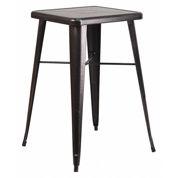 With its simple lines and bright color, this indoor-outdoor metal bar height table is sized right for small spaces.Compact in design, the table top is 23.75 inches square and has a 2 inch lip with rounded corners. The legs extend to 27.75 inches in width at the base. The table features a cross-brace that provides increased support and stability. Rubber floor glides protect your floor by sliding smoothly when you need to move the table. Galvanized steel construction and a powder coat finish ensure durability and easy maintenance.Designed for both commercial and residential use, this trend-setting table is a great choice for your home or the bar area in your restaurant. <ul><li>Metal Cafe Bar Table</li><li>Top Size: 23.75'' Square</li><li>Base Size: 27.75''W</li><li>2'' Thick Edge Top</li><li>Black-Antique Gold Powder Coat Finish</li><li>Galvanized Steel Construction</li><li>Cross Brace provides extra stability</li><li>Protective Rubber Floor Glides</li><li>Designed for Indoor and Outdoor Use</li><li>Designed for Commercial and Residential Use</li></ul>