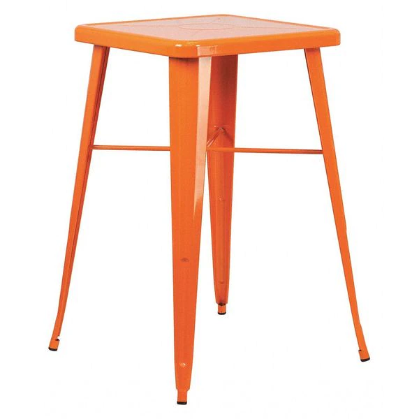 With its simple lines and bright color, this indoor-outdoor metal bar height table is sized right for small spaces.Compact in design, the table top is 23.75 inches square and has a 2 inch lip with rounded corners. The legs extend to 27.75 inches in width at the base. The table features a cross-brace that provides increased support and stability. Rubber floor glides protect your floor by sliding smoothly when you need to move the table. Galvanized steel construction and a powder coat finish ensure durability and easy maintenance.Designed for both commercial and residential use, this trend-setting table is a great choice for your home or the bar area in your restaurant. <ul><li>Metal Cafe Bar Table</li><li>Top Size: 23.75'' Square</li><li>Base Size: 27.75''W</li><li>2'' Thick Edge Top</li><li>Orange Powder Coat Finish</li><li>Galvanized Steel Construction</li><li>Cross Brace provides extra stability</li><li>Protective Rubber Floor Glides</li><li>Designed for Indoor and Outdoor Use</li><li>Designed for Commercial and Residential Use</li></ul>