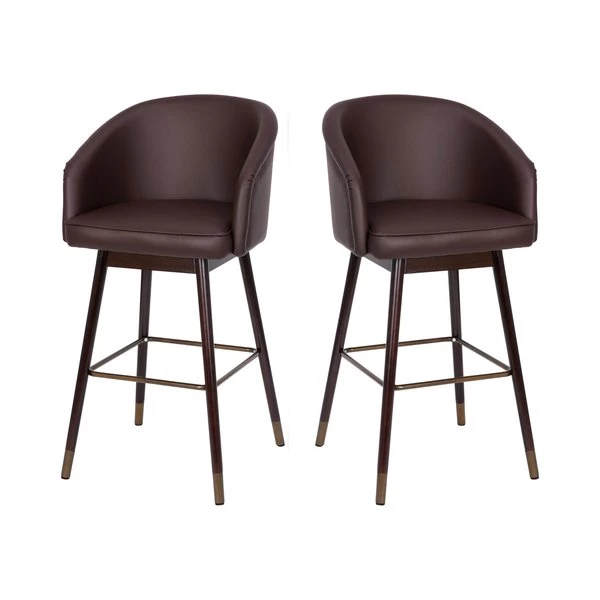 Bring your home or business into the 21st century with the modern trendy style of this set of 2 commercial grade stools available in bar and counter heights. Covered in soft and durable LeatherSoft upholstery and boasting soft bronze accents on the legs and footrest, the minimalist style of this mid-back 30" barstool is sure to be an asset in any decor. The contoured back, integrated arms, and high density foam padding give your guests the ultimate place to relax and unwind. Great style paired with superior strength and durability make this bar stool a must-have for both business and home environments. Solid beechwood legs paired with powder coated steel bracing that doubles as a footrest allow this upholstered stool to hold up to 300 lbs. static weight. Floor protector glides keep your hard flooring surfaces free from damage and assembly takes less than 30 minutes with the included tools and instructions. Wipe with a dry cloth to keep your new bar height chairs looking brand new.