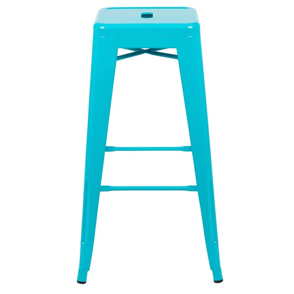 Add exciting furniture to your kitchen and dining room with this set of colorful metal bar stool. The industrial style stool conforms in modern and traditional spaces. Lower support braces doubles as a footrest, and floor glides protect your flooring. Use the cutout in the seat to carry the stool easily. Outfit your eatery with these beautiful stools. The classic metal stools look extraordinary when matched with metal or rustic dining tables. The bistro stools offer a chic option in contrast to conventional wood seating and are built for indoor use. The space-saving stool with tapered frame stacks up to 10 high for storage. Plastic bumper guards protect the frame finish while the stools are stacked. Complete your dining set by pairing the 4 metal stools with our metal indoor-outdoor bar table. Backless barstools provide a clean look at the dinner table.