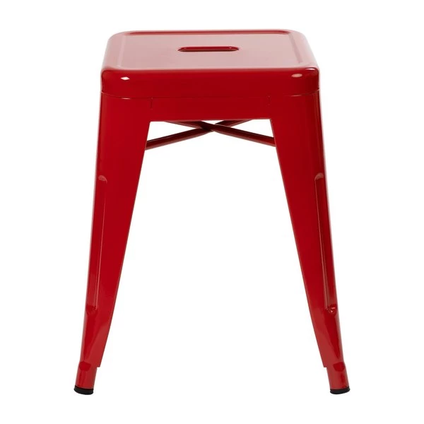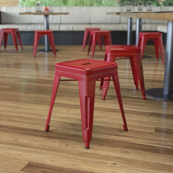 Give your kitchen or dining room an instant revamp when you choose the on-trend square shape of this set of 4 indoor metal kitchen table height stools. The streamlined silhouette of this short bar stool allows it to tuck under your dining room, cafe, or restaurant table to open up floor space. Great for small spaces like breakfast nooks, apartments or the corner bistro, the backless design gives an unobstructed view of your room for more visual space. Whether you're furnishing your home or business, a quality product is number one on your must-have list. Featuring welded construction with under seat bracing and created from 1 inch thick iron, this table stool will be a long-lasting addition to any space. This dining height stool has fixed rubber floor glides that will prevent damage to your hard flooring surfaces and is stackable up to 10 high for storage or routine cleaning. Easy clean up makes this standard height stool ideal for breakroom and lunchroom seating. Simply wipe clean with water followed by a dry cloth to maintain great looks. These dining chairs arrive fully assembled and ready to use for your convenience. Choose from an array of colors to match any decor.