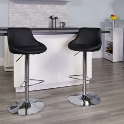 This dual purpose stool easily adjusts from counter to bar height. The bucket seat design will make this a great accent chair around the bar area or kitchen. The easy to clean vinyl upholstery is an added bonus when stool is used regularly. The height adjustable swivel seat adjusts from counter to bar height with the handle located below the seat. The chrome footrest supports your feet while also providing a contemporary chic design. To help protect your floors, the base features an embedded plastic ring.
