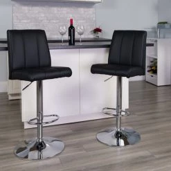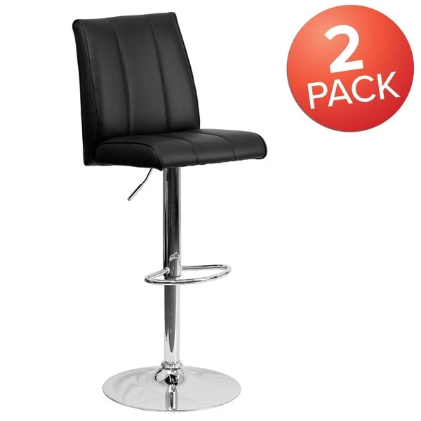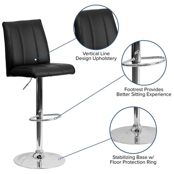 The black vinyl, adjustable height barstool is a great fit for your breakfast bar or kitchen counter. The seat and back are padded with 2" of foam and upholstered in sleek black vinyl with a vertical line design. The swivel seat easily adjusts from counter to bar height using the convenient gas lift handle, located just below the seat. The chrome base and footrest complement the stool's modern design and this stool will hold up to 330 pounds. Designed for residential use, this black vinyl barstool is an excellent choice when you want a contemporary look for your home.
