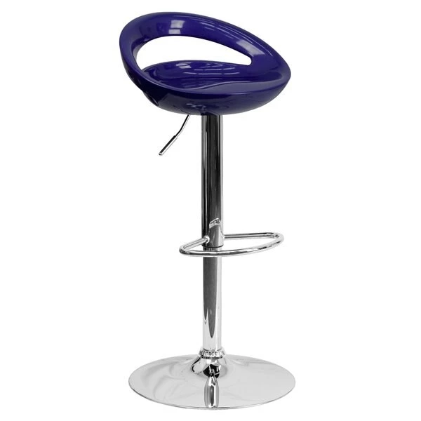 Shake things up and create a fun modern feel in your home with this glossy blue, height adjustable barstool. The cutout back and gentle curve in the smooth seat create sleek comfort. The dual purpose design performs as a counter height stool or a bar height stool. The height adjustable swivel seat adjusts from counter to bar height with the handle located below the seat. Made to support you while you relax, the stool includes extra back support in the design of the seat. To help protect your floors, the base features an embedded plastic ring. This stool would be great at the kitchen island or pub height dining table but you can add it anywhere you want a sleek, stylish look.