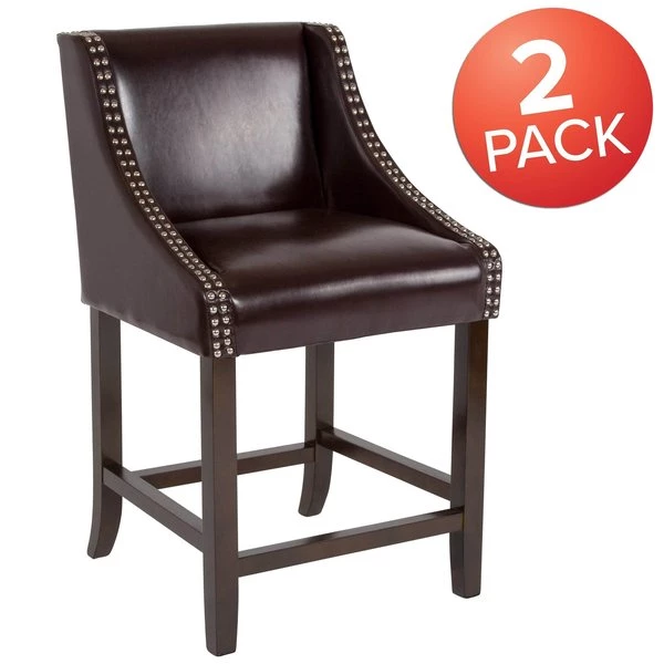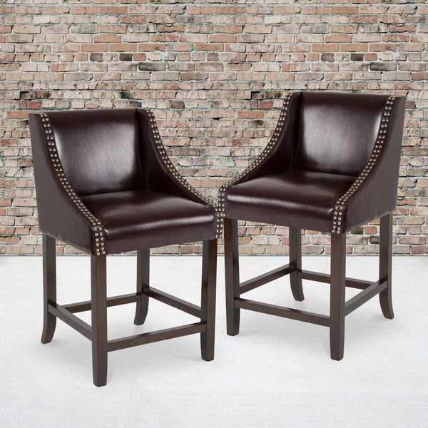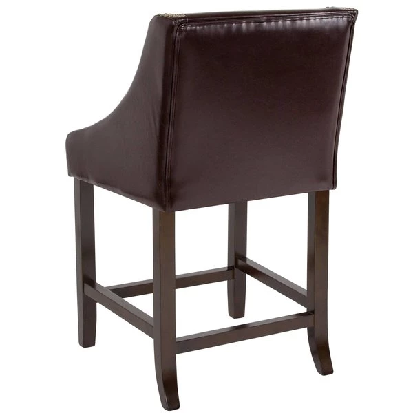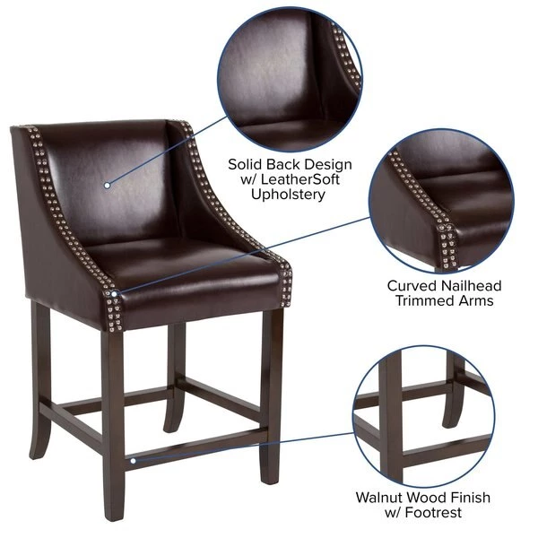 This classically sophisticated upholstered counter stool with decorative nail trimming lend a touch of old world elegance and comfort. The solid wood frame and legs are streamlined with a touch of whimsy mimicking the curved design details of the arms. The deep seat is an invitation to lounge, relax and enjoy the atmosphere. Enjoy the comforts of this stool anywhere around the home with its full back. To ensure smooth gliding and floor protection, glides have been added.