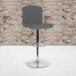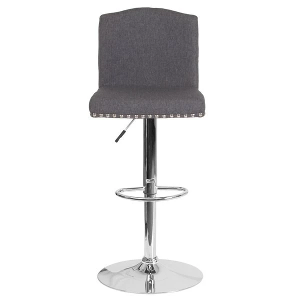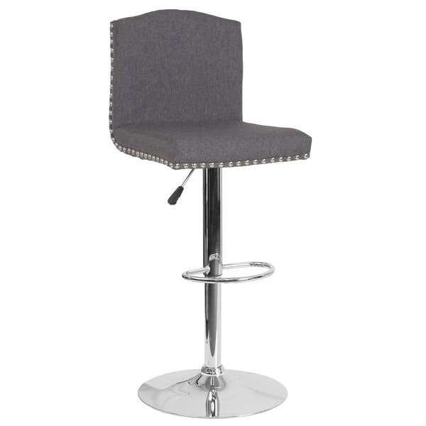 This stylish, adjustable height barstool provides just the right accent to feature at your breakfast bar or kitchen counter. The beautifully designed back has an arched peak. The seat is padded with 2" of foam and adorned with nail trim. The swivel seat easily adjusts from counter to bar height using the convenient gas lift handle, located just below the seat. The chrome details give it a modern contemporary appeal, while the contrasting decorative nail heads and curved lines are reminiscent of idyllic classical design. To help provide additional protection to the floors, the base has a concealed plastic ring. Designed for residential use, this barstool is an excellent choice when you want a contemporary look for your home.