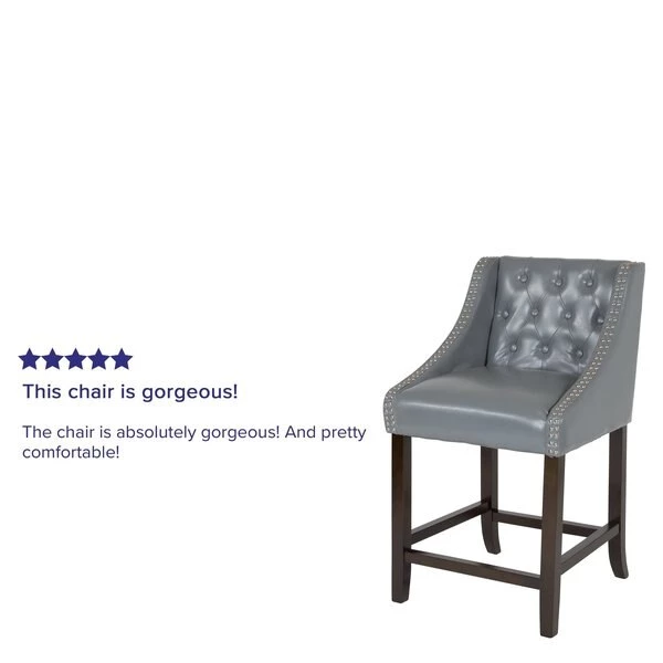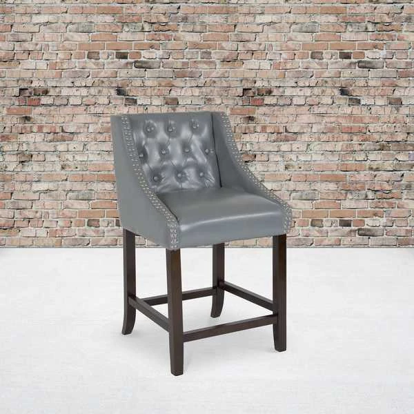 This classically sophisticated upholstered counter stool with decorative nail trimming lend a touch of old world elegance and comfort. The button tufted detail on the back of the upholstered body exudes beauty and nobility. The solid wood frame and legs are streamlined with a touch of whimsy mimicking the curved design details of the arms. The deep seat is an invitation to lounge, relax and enjoy the atmosphere. Enjoy the comforts of this stool anywhere around the home with its full back. To ensure smooth gliding and floor protection, glides have been added.