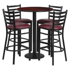 No need to buy in pieces, this complete Bar Height Table and Stool set will save you time! This set includes an elegant Mahogany Laminate Table Top, Round Base and 4 Metal Ladder Back Barstools. Use this setup in Bars, Banquet Halls, Restaurants, Break Room/Cafeteria Settings or any other social gathering. Mix in Bar Height Tables with standard height tables for a more varied seating selection. This Commercial Grade Table Set will last for years to come with its heavy duty construction. <ul><li>Bar Height Table and Stool Set</li><li>Set Includes 4 Barstools, Round Table Top and Round Base</li><li>Designed for Commercial and Home Use</li><li>Round Table</li><li>1.125'' Thick Round Top</li><li>Mahogany Laminate Finish</li><li>High Impact Melamine Core</li><li>Black T-Mold Protective Edging</li><li>18'' Round Restaurant Table Base with 3'' Diameter Bar Height Column</li><li>Cast Iron Construction</li></ul>