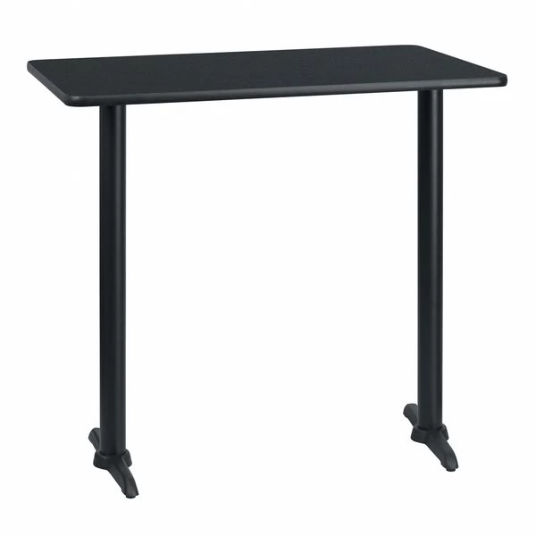 Complete your restaurant, break room or cafeteria with this table top and base configuration. This set is designed for commercial use to withstand the daily rigors in the hospitality industry. This set will also make a great option for your home as a dining table or in the rec room. Whether you are just starting your business or upgrading your furniture this table base will complete the look. <ul><li>Bar Height Hospitality Table</li><li>Black Laminate Top</li><li>Top Size: 30''W x 42''L</li><li>1.125'' Thick Top with melamine core</li><li>Black T-Mold Protective Edging</li><li>(2) 5'' x 22'' Table T-Base with 3'' Dia. Bar Height Column</li><li>Base Size: 22''W x 5''D x 42''H</li><li>Easy 2-Piece Base Assembly with Single Bolt</li><li>Top Plate Pre-Welded to Column</li><li>Cast Iron Construction</li></ul>