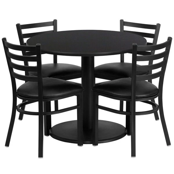 No need to buy in pieces, this complete Banquet Table and Chair set will save you time! This set includes an elegant Black Laminate Table Top, Round Base and 4 Metal Ladder Back Chairs. Use this setup for Banquet Halls, Wedding Ceremonies, Hotel Conferences, Restaurants, Break Room/Cafeteria Settings or any other social gathering. The lightweight designer metal chair will enhance any environment. This Commercial Grade Table Set will last for years to come with its heavy duty construction. <ul><li>Table and Chair Set</li><li>Set Includes 4 Chairs, Round Table Top and Round Base</li><li>Designed for Commercial and Home Use</li><li>Round Table</li><li>1.125'' Thick Round Top</li><li>Black Laminate Finish</li><li>High Impact Melamine Core</li><li>Black T-Mold Protective Edging</li><li>24'' Round Restaurant Table Base with 4'' Diameter Table Height Column</li><li>Cast Iron Construction</li></ul>