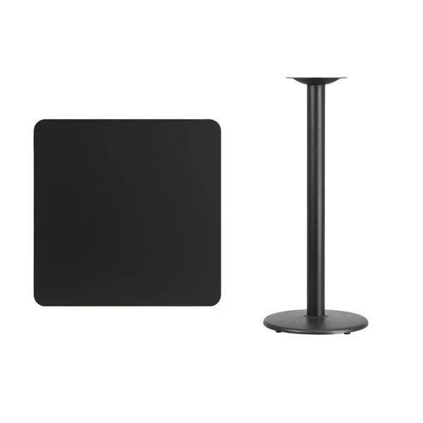 Complete your restaurant, break room or cafeteria with this table top and base configuration. This set is designed for commercial use to withstand the daily rigors in the hospitality industry. This set will also make a great option for your home as a dining table or in the rec room. Whether you are just starting your business or upgrading your furniture this table base will complete the look. <ul><li>Bar Height Hospitality Table</li><li>Black Laminate Top</li><li>Top Size: 30''W x 30''D</li><li>1.125'' Thick Top with melamine core</li><li>Black T-Mold Protective Edging</li><li>18'' Round Table Base with 3'' Dia. Bar Height Column</li><li>Base Size: 18''W x 42''H</li><li>Easy 2-Piece Base Assembly with Single Bolt</li><li>Top Plate Pre-Welded to Column</li><li>Cast Iron Construction</li></ul>