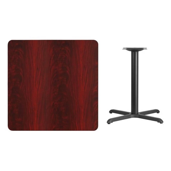 Complete your restaurant, break room or cafeteria with this table top and base configuration. This set is designed for commercial use to withstand the daily rigors in the hospitality industry. This set will also make a great option for your home as a dining table or in the rec room. Whether you are just starting your business or upgrading your furniture this table base will complete the look. <ul><li>Hospitality Table</li><li>Mahogany Laminate Top</li><li>Top Size: 36''W x 36''D</li><li>1.125'' Thick Top with melamine core</li><li>Black T-Mold Protective Edging</li><li>30'' x 30'' Table X-Base with 3'' Dia. Table Height Column</li><li>Base Size: 30''W x 30''D x 30''H</li><li>Easy 2-Piece Base Assembly with Single Bolt</li><li>Top Plate Pre-Welded to Column</li><li>Cast Iron Construction</li></ul>