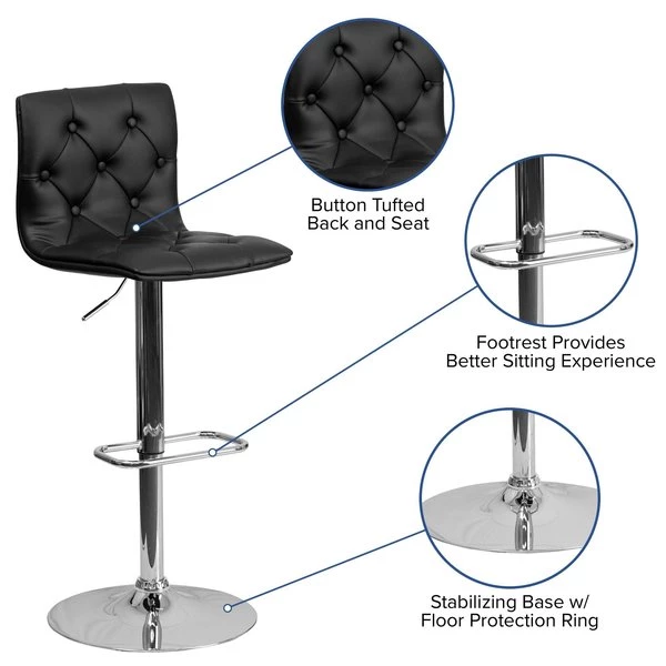 Classic style meets contemporary flair in this black adjustable height bar stool. Boasting attractive button tufted detailing with black vinyl upholstery, this bar stool is a modern addition to any setting, and will make a lovely accent stool in your kitchen, dining, or bar area. The height adjustable swivel seat adjusts from counter to bar height with the handle located below the seat. The base and footrest have a chrome finish to complement the chair's modern design. To help protect your floors, the base features an embedded plastic ring.