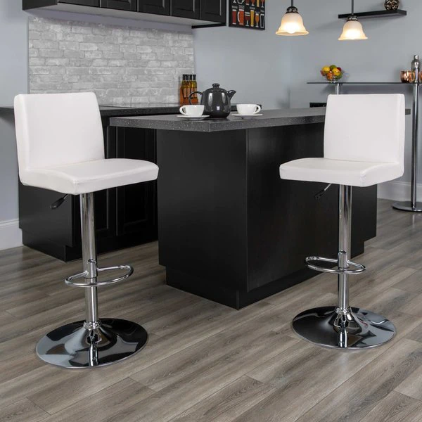 Relax and hang out in this adjustable height, panel back white barstool that proves simple doesn't have to be boring. This piece would be a great fit for your home bar, game room or kitchen island. The seat and back are padded with 2" of foam and upholstered in luxurious black vinyl. The swivel seat easily adjusts from counter to bar height using the convenient gas lift handle, located just below the seat. The chrome base and footrest complement the stool's modern design and this stool will hold up to 330 pounds. Designed for residential use, this black vinyl barstool is an excellent choice when you want a contemporary look for your home.