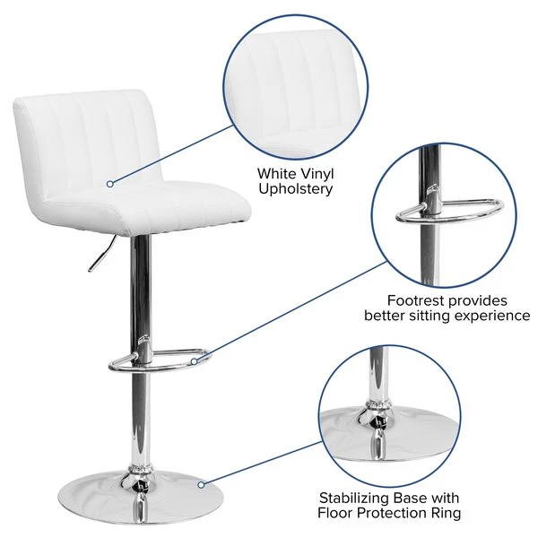 Sleek and stylish will be the bywords of this elegant adjustable height barstool. Featuring gorgeous white vinyl upholstery in a classic shade with a chrome base, this designer chair will enhance the look of your decor and make an attractive statement in any home. The height adjustable swivel seat adjusts from counter to bar height with the handle located below the seat. The chrome footrest supports your feet while also providing a contemporary chic design. To help protect your floors, the base features an embedded plastic ring.