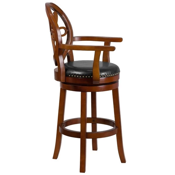 If you want your design to say timeless when you're dressing your entertainment space then this brandy wood finish barstool with arms will make a beautiful statement. Classically designed and very easy on the eye, this stool, boasting soft and durable black LeatherSoft upholstery, will lend your kitchen, dining room, bar or game room an upscale sophistication. Stool features an oval carved pattern designer back, decorative nail trimming on the seat and gracefully flared legs. The 360 degree swivel seat allows you to swing around effortlessly while the durable wood frame is stabilized with the included foot ring. Spills clean up easily with a solvent and water-based cleaner such as foam while the floor glides help protect your floors and ensure smooth gliding. This stool offers sublime comfort along with class.
