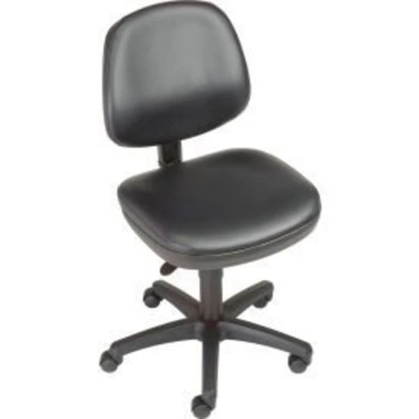INTERION ; VINYL CHAIR WITH 26 INCH BASE WITH ARMS DURABLE, FUNCTIONAL SEATING WITH WIPE-CLEAN VINYL CHAIR. INCLUDES CONTOURED FOAM-PADDED SEAT AND BACK TO PROVIDE ULTIMATE COMFORT FOR LONG TERM SITTING. STRONG 5 BLADE BASE INCLUDES BOTH CASTERS FOR MOBILE USE AND GLIDES FOR STATIONARY USE. PNEUMATIC HEIGHT ADJUSTS FROM 17"-22". EASY ASSEMBLY. BRAND IS INTERION ; BY Global. 2 YEAR LIMITED WARRANTY NOTE: IMAGE ABOVE SHOWS CHAIR WITHOUT ARMS.