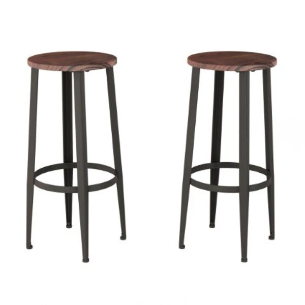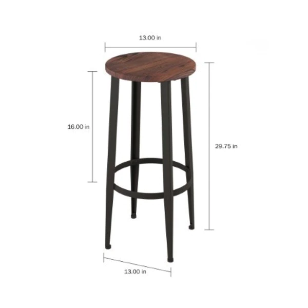 Add visual interest as well as functional seating to your dining or bar area with the set of two Round Metal Bar Stools from Hastings Home. These 29.75-inch tall backless chairs are made from sturdy iron with a powder coated coffee color finish, topped with a 13-inch diameter elm wood seat stained in dark walnut and durable enough to hold up to 265-pounds each. Designed with feet rest loops around the frame and plastic feet on each leg to protect your flooring, these pub height stools have the right combination of modern style with vintage farmhouse and industrial undertones that fit an array of home decor types.