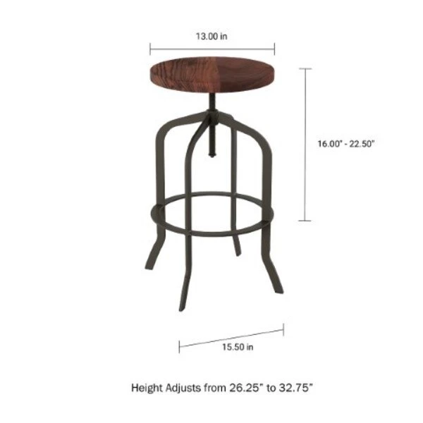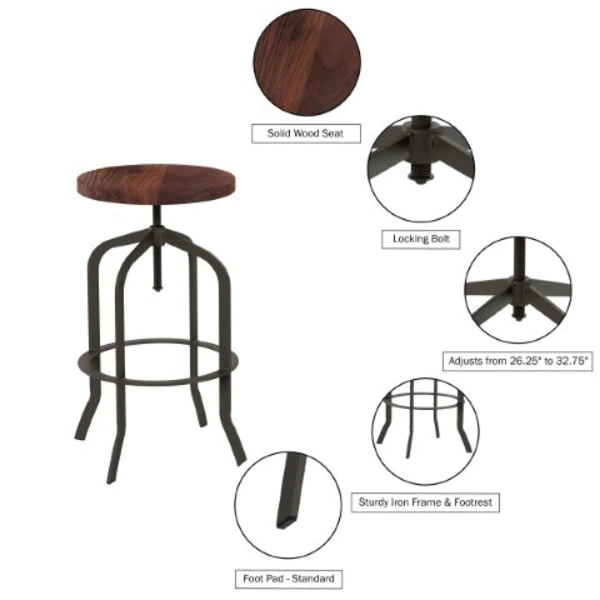 The angled metal frame and real Elm seat of the Swivel Bar Stool by Hastings Home creates a stylish look that's sure to complement both vintage farmhouse and modern industrial decor in any home! With a seat that adjusts from 26.25-in to 32.75-in, the stool can be adapted to fit counter or bar heights, while the 360 degree swivel provides added versatility. Constructed from sturdy iron and wood, this high-quality stool has a 265 lb weight capacity, a locking bolt on the seat, and has plastic feet to protect your floors. It's a fantastic piece of functional accent furniture that will add a unique touch to your kitchen, dining room, or bar!