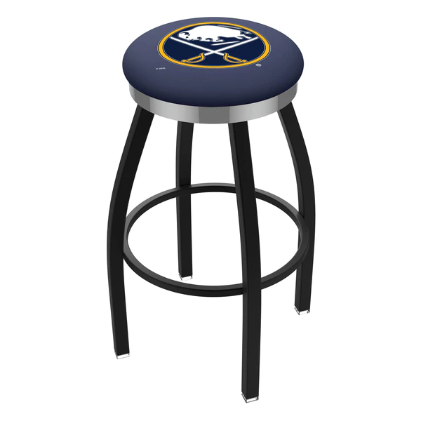 Made for the ultimate sports fan, you will be proud to show where your loyalty lies with this impressive Officially Licensed stool from the Holland Bar Stool Co. This contemporary L8B2C stool has a single-ring black wrinkle base with a 2 1/2" thick cushion sitting on top of a 2" chrome ring that conceals the swivel for an exceptionally clean look. A state of the art print process is used in applying specially formulated UV vinyl ink in numerous stages to produce a sharp, crisp, clear image to ensure a perfect reproduction of the logo. You won't find a higher quality logo stool on the market. The frame is made from commercial quality 16 gauge, 1 1/4 inch tube steel with solid mig welded joints to guarantee strength and durability. The powder coated finish resists chips and scratches and ensures a long-lasting, rich appearance. The cushion seats are of the highest quality as well, utilizing a breathable, commercial grade vinyl. At the heart of the cushion is highly-dense foam that provides maximum support and will not breakdown in a couple years. If you're going to finish your bar, game room, or man cave do it right- with a logo stool made by the Holland Bar Stool Co.