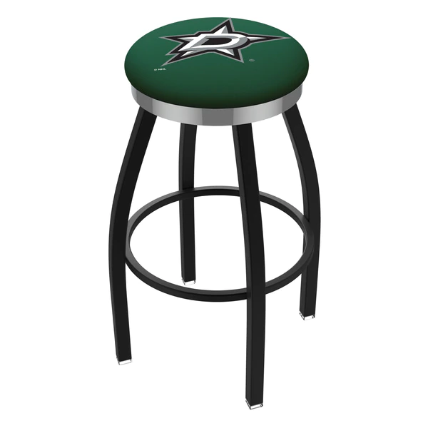 Made for the ultimate sports fan, you will be proud to show where your loyalty lies with this impressive Officially Licensed stool from the Holland Bar Stool Co. This contemporary L8B2C stool has a single-ring black wrinkle base with a 2 1/2" thick cushion sitting on top of a 2" chrome ring that conceals the swivel for an exceptionally clean look. A state of the art print process is used in applying specially formulated UV vinyl ink in numerous stages to produce a sharp, crisp, clear image to ensure a perfect reproduction of the logo. You won't find a higher quality logo stool on the market. The frame is made from commercial quality 16 gauge, 1 1/4 inch tube steel with solid mig welded joints to guarantee strength and durability. The powder coated finish resists chips and scratches and ensures a long-lasting, rich appearance. The cushion seats are of the highest quality as well, utilizing a breathable, commercial grade vinyl. At the heart of the cushion is highly-dense foam that provides maximum support and will not breakdown in a couple years. If you're going to finish your bar, game room, or man cave do it right- with a logo stool made by the Holland Bar Stool Co.