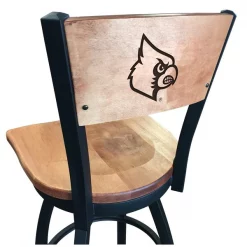 Made for the ultimate sports fan, you will be proud to show where your loyalty lies with this impressive Officially Licensed stool from the Holland Bar Stool Co. Add a touch of class with this L038 Laser Engraved, swivel logo stool that has a medium finished wood back that doesn't just add comfort, but sophistication. The back is first laser engraved with your teams logo on state of the art equipment and then finished and sealed to ensure the best quality product possible. You won't find a higher quality logo stool on the market. The frame is made from commercial quality 16 gauge, 1 1/4 inch tube steel with solid mig welded joints to guarantee strength and durability. The powder coated finish resists chips and scratches and ensures a long-lasting, rich appearance. The wood seat is 1 3/4 inch solid maple and is dished for amazing posterior comfort, making sitting for minutes or hours a pleasure. If you're going to finish your bar, game room, or man cave do it right- with a logo stool made by the Holland Bar Stool Co.