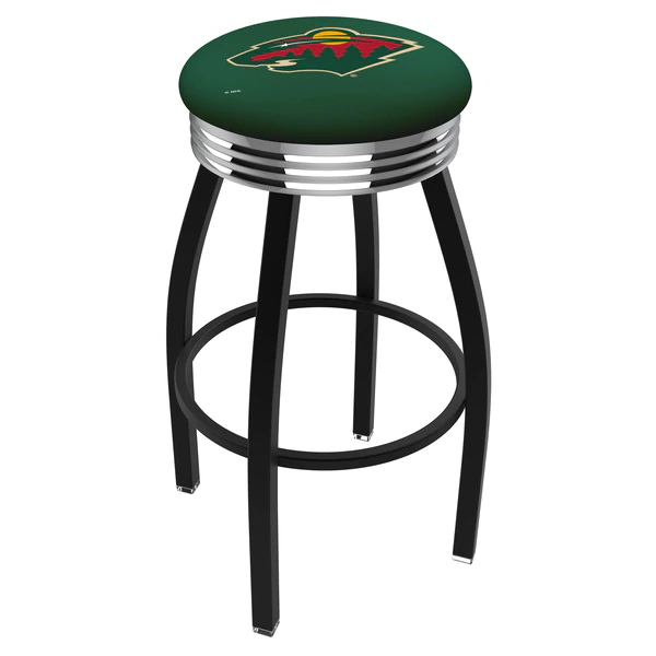 Made for the ultimate sports fan, you will be proud to show where your loyalty lies with this impressive Officially Licensed stool from the Holland Bar Stool Co. This classic L8B3C stool features a single-ring black wrinkle base with a 2 1/2" thick cushion sitting on top of a 2.75" chrome ribbed ring that conceals the swivel for an exceptionally clean look. A state of the art print process is used in applying specially formulated UV vinyl ink in numerous stages to produce a sharp, crisp, clear image to ensure a perfect reproduction of the logo. You won't find a higher quality logo stool on the market. The frame is made from commercial quality 16 gauge, 1 1/4 inch tube steel with solid mig welded joints to guarantee strength and durability. The powder coated finish resists chips and scratches and ensures a long-lasting, rich appearance. The cushion seats are of the highest quality as well, utilizing a breathable, commercial grade vinyl. At the heart of the cushion is highly-dense foam that provides maximum support and will not breakdown in a couple years. If you're going to finish your bar, game room, or man cave do it right- with a logo stool made by the Holland Bar Stool Co.