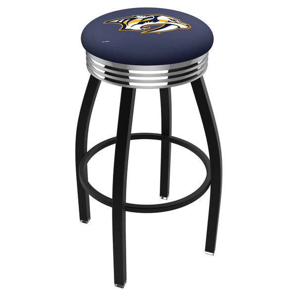 Made for the ultimate sports fan, you will be proud to show where your loyalty lies with this impressive Officially Licensed stool from the Holland Bar Stool Co. This classic L8B3C stool features a single-ring black wrinkle base with a 2 1/2" thick cushion sitting on top of a 2.75" chrome ribbed ring that conceals the swivel for an exceptionally clean look. A state of the art print process is used in applying specially formulated UV vinyl ink in numerous stages to produce a sharp, crisp, clear image to ensure a perfect reproduction of the logo. You won't find a higher quality logo stool on the market. The frame is made from commercial quality 16 gauge, 1 1/4 inch tube steel with solid mig welded joints to guarantee strength and durability. The powder coated finish resists chips and scratches and ensures a long-lasting, rich appearance. The cushion seats are of the highest quality as well, utilizing a breathable, commercial grade vinyl. At the heart of the cushion is highly-dense foam that provides maximum support and will not breakdown in a couple years. If you're going to finish your bar, game room, or man cave do it right- with a logo stool made by the Holland Bar Stool Co.