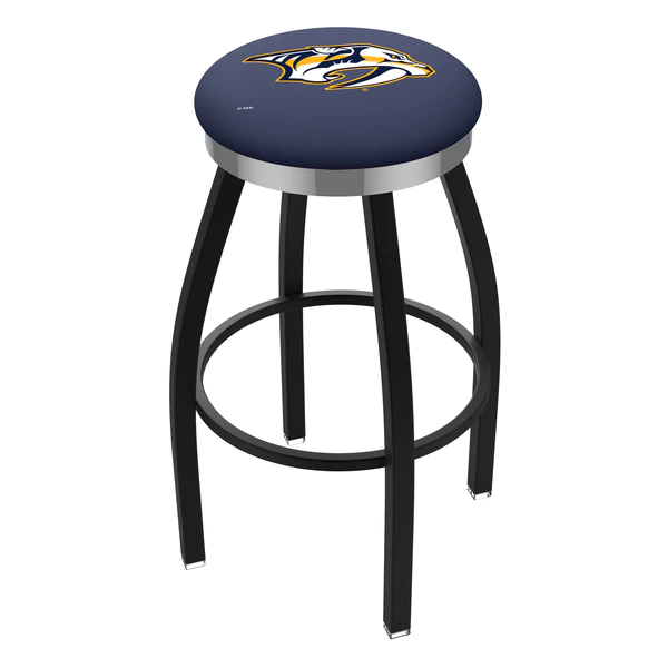 Made for the ultimate sports fan, you will be proud to show where your loyalty lies with this impressive Officially Licensed stool from the Holland Bar Stool Co. This contemporary L8B2C stool has a single-ring black wrinkle base with a 2 1/2" thick cushion sitting on top of a 2" chrome ring that conceals the swivel for an exceptionally clean look. A state of the art print process is used in applying specially formulated UV vinyl ink in numerous stages to produce a sharp, crisp, clear image to ensure a perfect reproduction of the logo. You won't find a higher quality logo stool on the market. The frame is made from commercial quality 16 gauge, 1 1/4 inch tube steel with solid mig welded joints to guarantee strength and durability. The powder coated finish resists chips and scratches and ensures a long-lasting, rich appearance. The cushion seats are of the highest quality as well, utilizing a breathable, commercial grade vinyl. At the heart of the cushion is highly-dense foam that provides maximum support and will not breakdown in a couple years. If you're going to finish your bar, game room, or man cave do it right- with a logo stool made by the Holland Bar Stool Co.