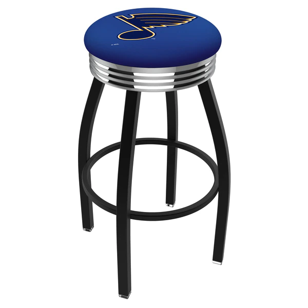 Made for the ultimate sports fan, you will be proud to show where your loyalty lies with this impressive Officially Licensed stool from the Holland Bar Stool Co. This classic L8B3C stool features a single-ring black wrinkle base with a 2 1/2" thick cushion sitting on top of a 2.75" chrome ribbed ring that conceals the swivel for an exceptionally clean look. A state of the art print process is used in applying specially formulated UV vinyl ink in numerous stages to produce a sharp, crisp, clear image to ensure a perfect reproduction of the logo. You won't find a higher quality logo stool on the market. The frame is made from commercial quality 16 gauge, 1 1/4 inch tube steel with solid mig welded joints to guarantee strength and durability. The powder coated finish resists chips and scratches and ensures a long-lasting, rich appearance. The cushion seats are of the highest quality as well, utilizing a breathable, commercial grade vinyl. At the heart of the cushion is highly-dense foam that provides maximum support and will not breakdown in a couple years. If you're going to finish your bar, game room, or man cave do it right- with a logo stool made by the Holland Bar Stool Co.