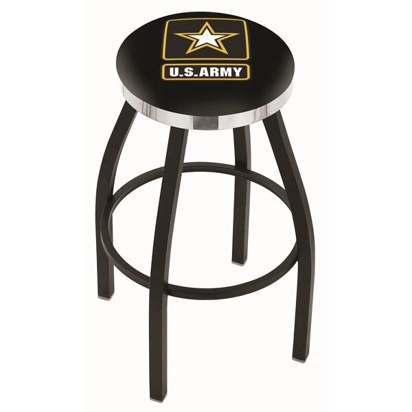 Show your support for our troops (past and present) with this impressive Officially Licensed stool from the Holland Bar Stool Co. This contemporary L8B2C stool has a single-ring black wrinkle base with a 2 1/2" thick cushion sitting on top of a 2" chrome ring that conceals the swivel for an exceptionally clean look. A state of the art print process is used in applying specially formulated UV vinyl ink in numerous stages to produce a sharp, crisp, clear image to ensure a perfect reproduction of the logo. You won't find a higher quality logo stool on the market. The frame is made from commercial quality 16 gauge, 1 1/4 inch tube steel with solid mig welded joints to guarantee strength and durability. The powder coated finish resists chips and scratches and ensures a long-lasting, rich appearance. The cushion seats are of the highest quality as well, utilizing a breathable, commercial grade vinyl. At the heart of the cushion is highly-dense foam that provides maximum support and will not breakdown in a couple years. If you're going to finish your bar, game room, or man cave do it right- with a logo stool made by the Holland Bar Stool Co.