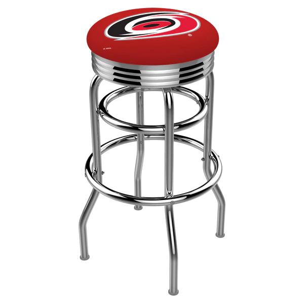 Made for the ultimate sports fan, you will be proud to show where your loyalty lies with this impressive Officially Licensed stool from the Holland Bar Stool Co. This L7C3C double ring swivel stool has a style that brings you back in time featuring a 2.75" chrome ribbed accent ring that conceals the swivel for a very clean look. A state of the art print process is used in applying specially formulated UV vinyl ink in numerous stages to produce a sharp, crisp, clear image to ensure a perfect reproduction of the logo. You won't find a higher quality logo stool on the market. The frame is made from commercial grade steel that is strong, durable, and triple chrome-plated to guarantee a long-lasting, rich finish capable of withstanding the abuse of your rowdiest of friends for years to come. The cushion seats are of the highest quality as well, utilizing a breathable, commercial grade vinyl. At the heart of the cushion is 2 1/2 inches of highly-dense foam that provides maximum support and will not breakdown in a couple years. If you're going to finish your bar, game room, or man cave do it right- with a logo stool made by the Holland Bar Stool Co.