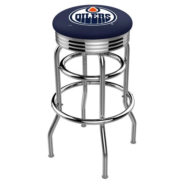Made for the ultimate sports fan, you will be proud to show where your loyalty lies with this impressive Officially Licensed stool from the Holland Bar Stool Co. This L7C3C double ring swivel stool has a style that brings you back in time featuring a 2.75" chrome ribbed accent ring that conceals the swivel for a very clean look. A state of the art print process is used in applying specially formulated UV vinyl ink in numerous stages to produce a sharp, crisp, clear image to ensure a perfect reproduction of the logo. You won't find a higher quality logo stool on the market. The frame is made from commercial grade steel that is strong, durable, and triple chrome-plated to guarantee a long-lasting, rich finish capable of withstanding the abuse of your rowdiest of friends for years to come. The cushion seats are of the highest quality as well, utilizing a breathable, commercial grade vinyl. At the heart of the cushion is 2 1/2 inches of highly-dense foam that provides maximum support and will not breakdown in a couple years. If you're going to finish your bar, game room, or man cave do it right- with a logo stool made by the Holland Bar Stool Co.