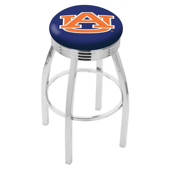 Made for the ultimate sports fan, you will be proud to show where your loyalty lies with this impressive Officially Licensed stool from the Holland Bar Stool Co. This classic L8C3C stool features a single-ring chrome base with a 2 1/2" thick cushion sitting on top of a 2.75" chrome ribbed ring that conceals the swivel for an exceptionally clean look. A state of the art print process is used in applying specially formulated UV vinyl ink in numerous stages to produce a sharp, crisp, clear image to ensure a perfect reproduction of the logo. You won't find a higher quality logo stool on the market. The frame is made from commercial quality 16 gauge, 1 1/4 inch tube steel with solid mig welded joints to guarantee strength and durability. The triple chrome plated finish resists chips and scratches and ensures a long-lasting, rich appearance. The cushion seats are of the highest quality as well, utilizing a breathable, commercial grade vinyl. At the heart of the cushion is highly-dense foam that provides maximum support and will not breakdown in a couple years. If you're going to finish your bar, game room, or man cave do it right- with a logo stool made by the Holland Bar Stool Co.