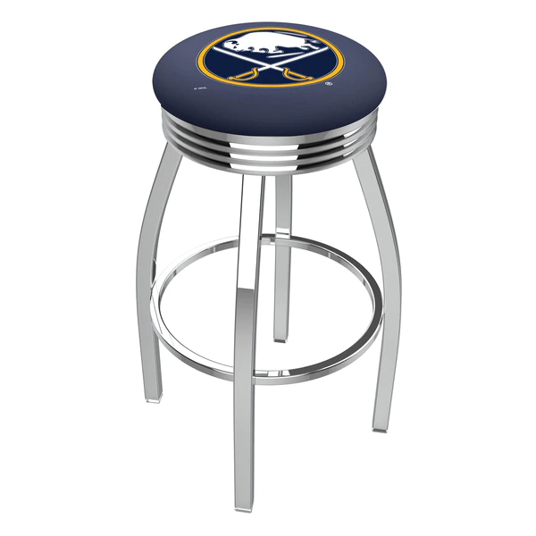 Made for the ultimate sports fan, you will be proud to show where your loyalty lies with this impressive Officially Licensed stool from the Holland Bar Stool Co. This classic L8C3C stool features a single-ring chrome base with a 2 1/2" thick cushion sitting on top of a 2.75" chrome ribbed ring that conceals the swivel for an exceptionally clean look. A state of the art print process is used in applying specially formulated UV vinyl ink in numerous stages to produce a sharp, crisp, clear image to ensure a perfect reproduction of the logo. You won't find a higher quality logo stool on the market. The frame is made from commercial quality 16 gauge, 1 1/4 inch tube steel with solid mig welded joints to guarantee strength and durability. The triple chrome plated finish resists chips and scratches and ensures a long-lasting, rich appearance. The cushion seats are of the highest quality as well, utilizing a breathable, commercial grade vinyl. At the heart of the cushion is highly-dense foam that provides maximum support and will not breakdown in a couple years. If you're going to finish your bar, game room, or man cave do it right- with a logo stool made by the Holland Bar Stool Co.