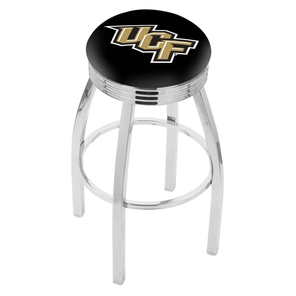 Made for the ultimate sports fan, you will be proud to show where your loyalty lies with this impressive Officially Licensed stool from the Holland Bar Stool Co. This classic L8C3C stool features a single-ring chrome base with a 2 1/2" thick cushion sitting on top of a 2.75" chrome ribbed ring that conceals the swivel for an exceptionally clean look. A state of the art print process is used in applying specially formulated UV vinyl ink in numerous stages to produce a sharp, crisp, clear image to ensure a perfect reproduction of the logo. You won't find a higher quality logo stool on the market. The frame is made from commercial quality 16 gauge, 1 1/4 inch tube steel with solid mig welded joints to guarantee strength and durability. The triple chrome plated finish resists chips and scratches and ensures a long-lasting, rich appearance. The cushion seats are of the highest quality as well, utilizing a breathable, commercial grade vinyl. At the heart of the cushion is highly-dense foam that provides maximum support and will not breakdown in a couple years. If you're going to finish your bar, game room, or man cave do it right- with a logo stool made by the Holland Bar Stool Co.